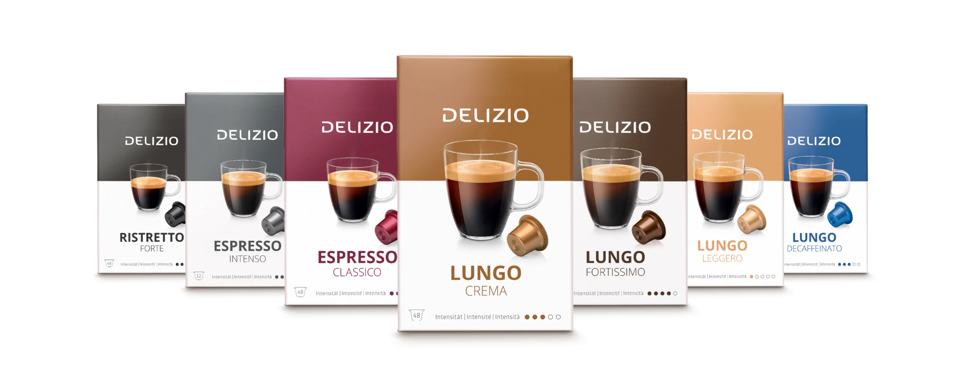 Zur Auswahl stehen: Espresso Classico, Lungo Crema, Lungo Fortissimo, Lungo Leggero, Lungo Decaffeinato oder Ristretto Forte.