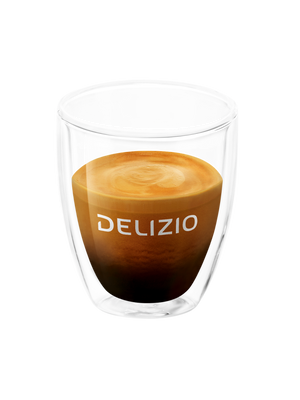 Set mit 2 Espresso-Tassen (ca 80 ml) aus Thermo-Glas. Die Gläser sind modern, ohne Henkel und mit einem Delizio Logo versehen.
